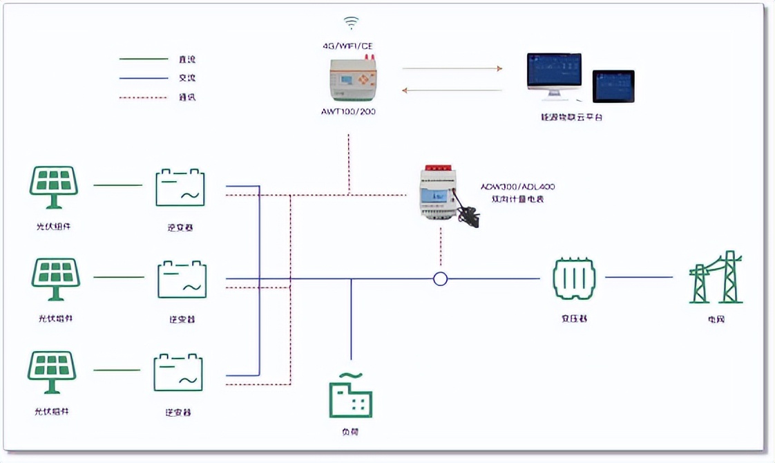 物联网防逆流解决方案比较适用在工商业光伏、户用光储中余电不上网的场景,解决防逆流的问题。常见配置硬件包括安科瑞AWT系列物联网网关(内置智能算法可以实时跟踪负荷变化,动态调节逆变器的有功功率),以及安科瑞ADW300/ADL400系列双向计量电表(监测市电总进线处的功率)。