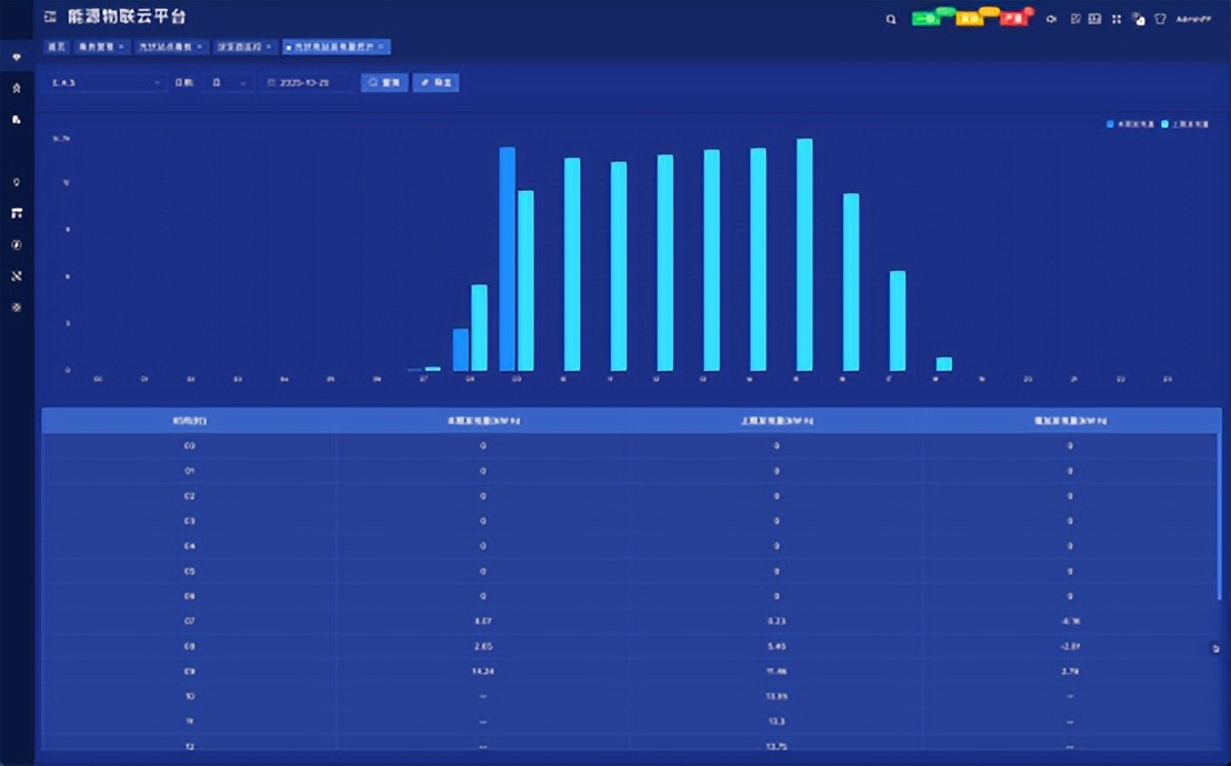 以柱状图和表格两种形式展示了光伏电站的发电量数据。切换年月日和日期可查看不同时间段的发电量与同时段往期数据。本页面支持报表导出,点击导出按钮即可导出相应数据,导出报表为excel格式。