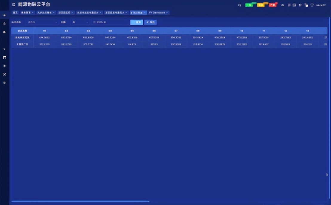 以表格的形式展示了各站点的发电收益数据。切换年月日和日期可查看不同时段的收益数据。本页面支持报表导出,点击导出按钮即可导出相应数据,导出报表为excel格式。