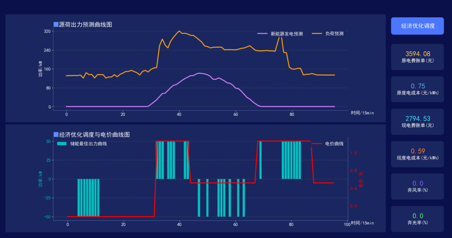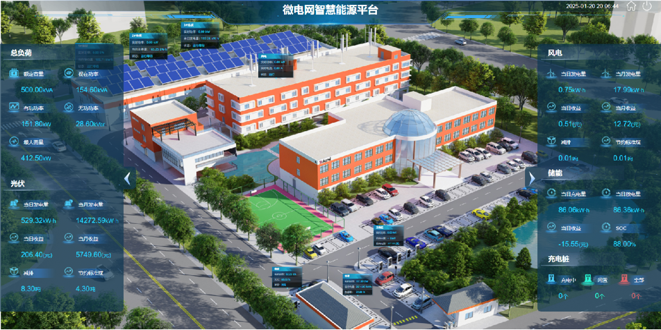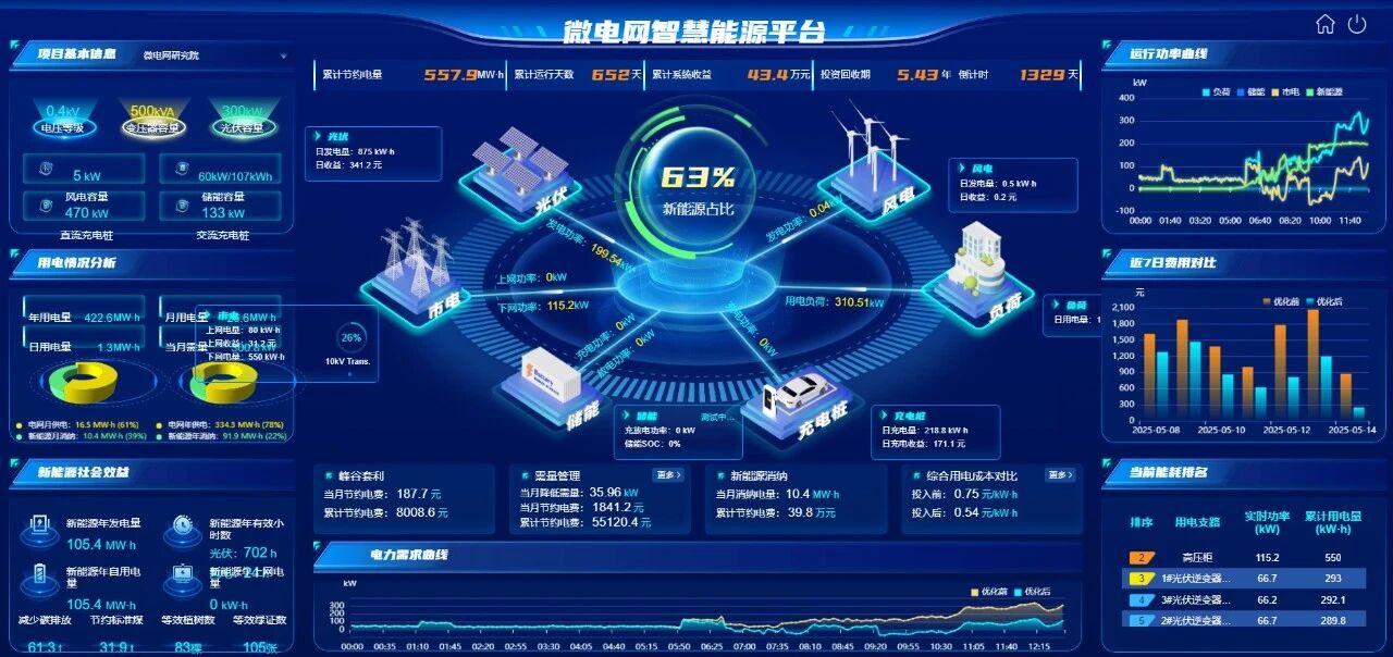 源-网-荷-储-充.....等全量运行数据,存储展示、状态检测、运行告警。直观展示微电网系统电量、碳排、成本、设备运行等各类数据。实时呈现微电网电力数据流向和设备安全情况。