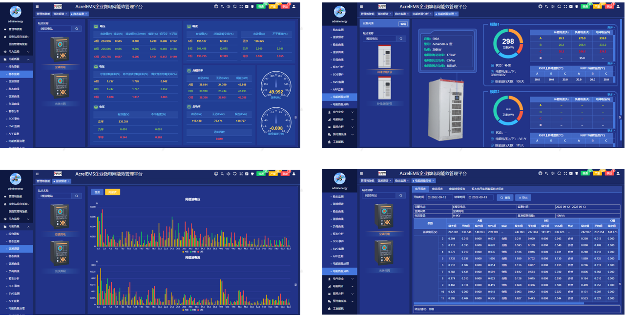 监测各进线回路电能质量,包括电压暂降、暂态、稳态、谐波畸变等数据波形记录,进而判断配电系统扰动方向,生成电能质量分析报告。