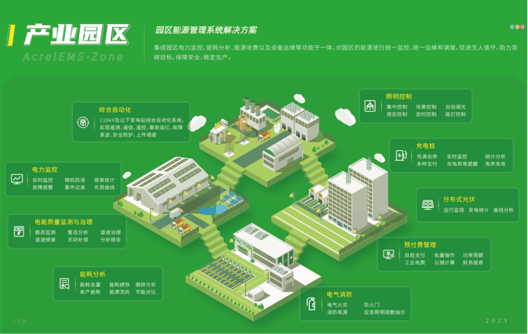 AcrelEMS园区智慧能源管理系统,以“零碳电源”和“能源调度”为核心策略,结合物联网和人工智能技术,打造零碳园区解决方案。方案涵盖了可再生能源、电化学储能、智能充电设施、微电网技术、节能策略、智慧运营等领域,实现了从能源生产、消费、存储到管理的全链条碳减排。提升园区的绿电占比,促进绿电高效消纳,降低能源成本,提高能源效率,推动园区实现可持续发展,迈向一个经济、环境双重效益的零碳未来。
