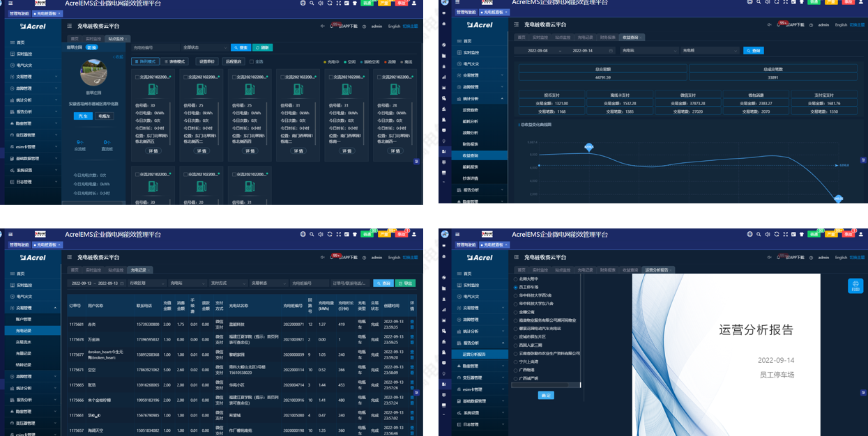 对平台和充电桩的运营情况进行统计,并生成财务报表和运营报告,包括用户充值信息、充电量/充电金额/充电时长等充电信息、用户充值记录、用户消费记录等