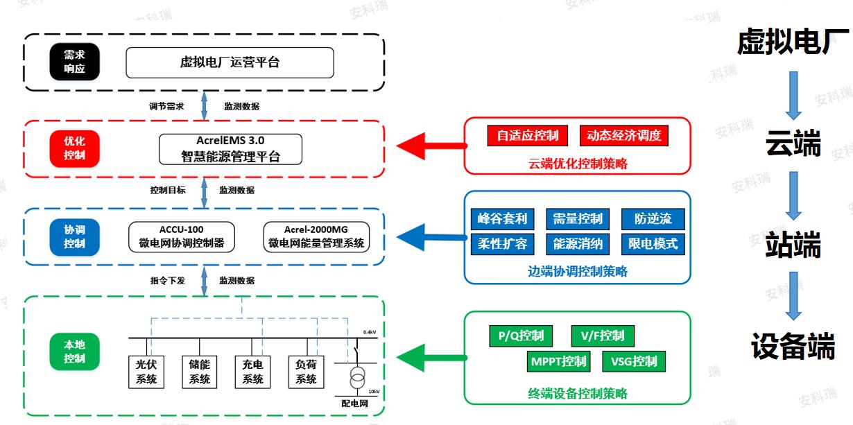 微电网作为区域能源自治与协同运行的核心单元,实现了内部资源的精准管理和优化调度。安科瑞微电网能量管理系统通过结合仪表和保护设备,将微电网安全可靠接入虚拟电厂,并将虚拟电厂功率响应目标自动分解并执行内部资源的优化分配,以达成该目标。将微电网打造为虚拟电厂参与电网互动的灵活单元,显著提升区域供电可靠性与能源利用效率。