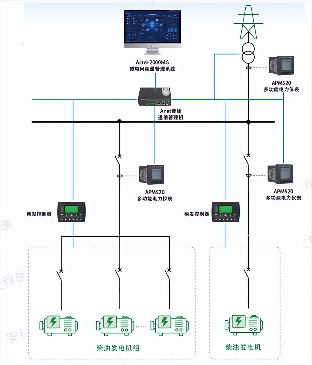 柴油发电机在虚拟电厂中从单纯的“备用”扩展到了“可调度的资源”。可采用Acrel-2000MG能量管理系统对柴发控制器远程启停控制、功率精准调节与运行状态监测,将柴油发电机整合为虚拟电厂的可调度资源。部分地区对柴油发电机参与虚拟电厂给予政策支持,促进柴油发电机在虚拟电厂中参与应急和调峰。