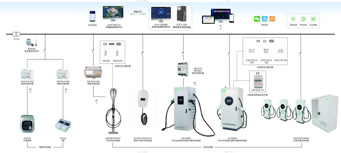 安科瑞充电桩解决方案,通过对充电桩配电回路加装计量、限流式保护器、绝缘监测等设备,结合充电桩运营管理平台把分散的交流/直流充电桩安全可靠聚合,在满足车主用能体验的前提下,实现虚拟电厂需求响应和功率调度。
