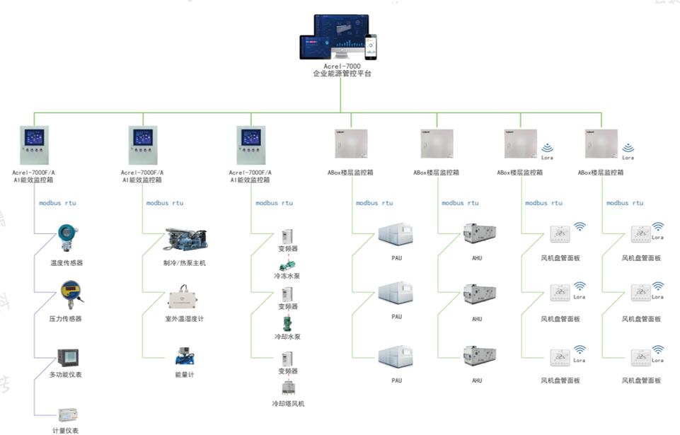 安科瑞智慧空调控制系统利用AI能效监控箱通过表计、温度、压力传感器、温度计和能量计等进行采集分析,对水泵、风机、变频器、预冷空调箱、组合式空调箱等进行温度设定调节、运行策略优化等控制,将空调聚合为虚拟电厂的快速响应单元,在不影响舒适度的前提下实现精准的负荷调控,为电网提供可持续的削峰填谷能力。