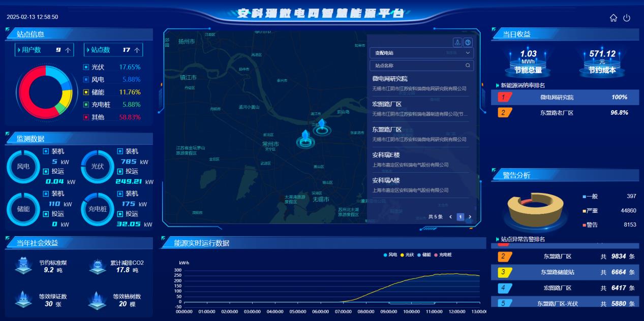 (1)可以展示接入所有站点的综合数据,含接入站点数、告警信息、总的发电数据、用电数据、 充放电数据及能耗排名、运行曲线。