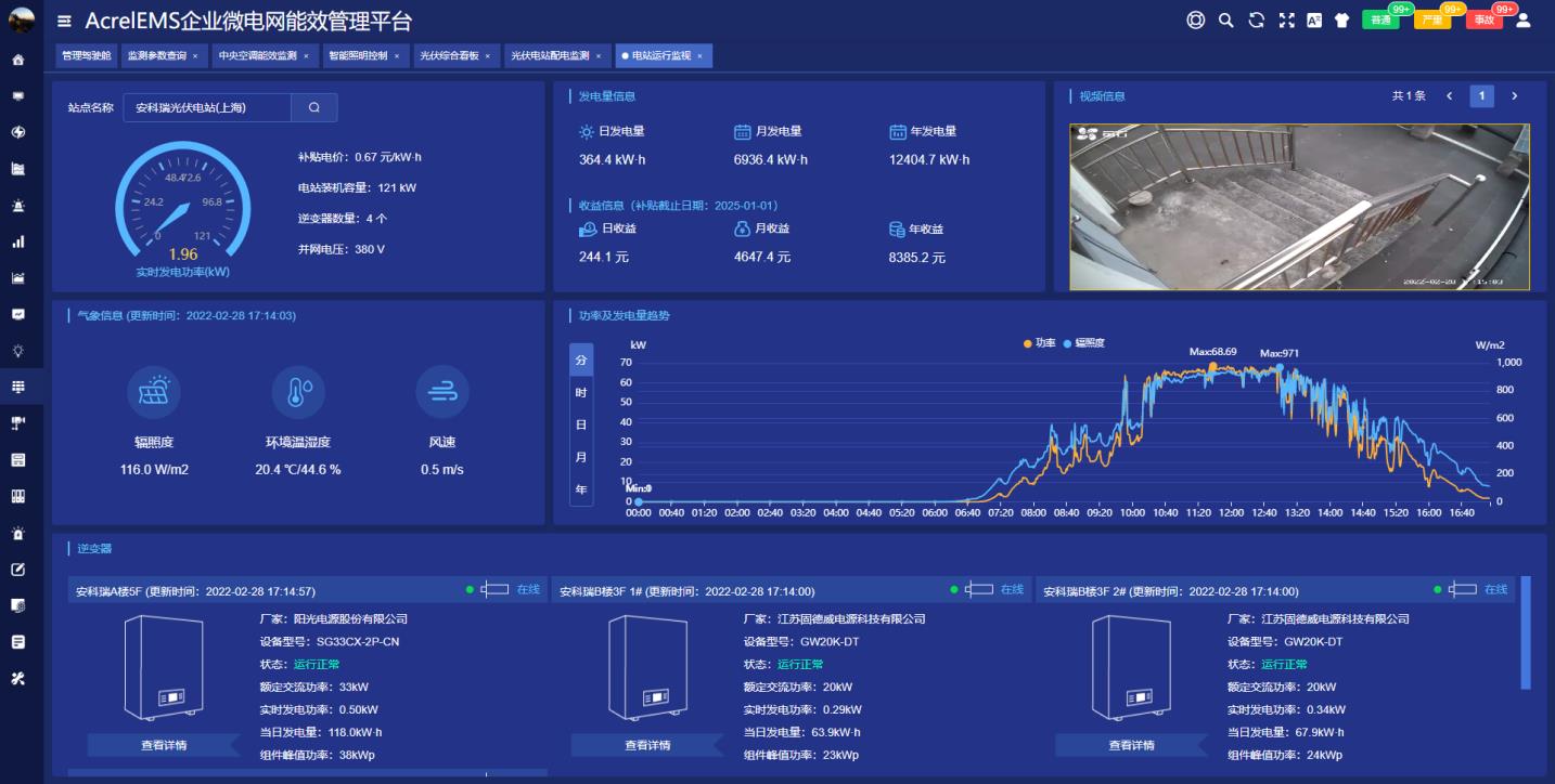 (2)对单个电站运行情况进行监控,展示日月年发电量,功率曲线,逆变器参数,辐 照度,环境温湿度,风速。帮助用户了解当前站点的基本信息和运行状态。