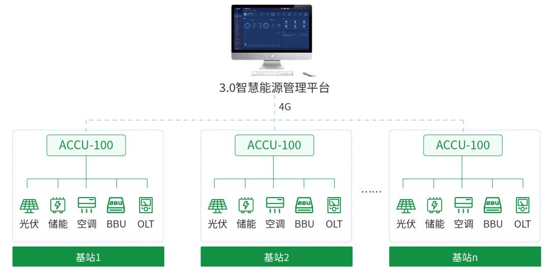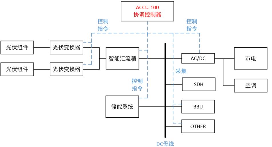 根据基站的构成以及基站设备需求,可通过 ACCU-100 协调控制器,获取基站光储系 统内光伏系统的输出功率、储能状态、电价信息,调配光伏系统、市电、储能电池对所述 5G 基站通信设备的供电量。其基站光储系统结构示意图如下:
