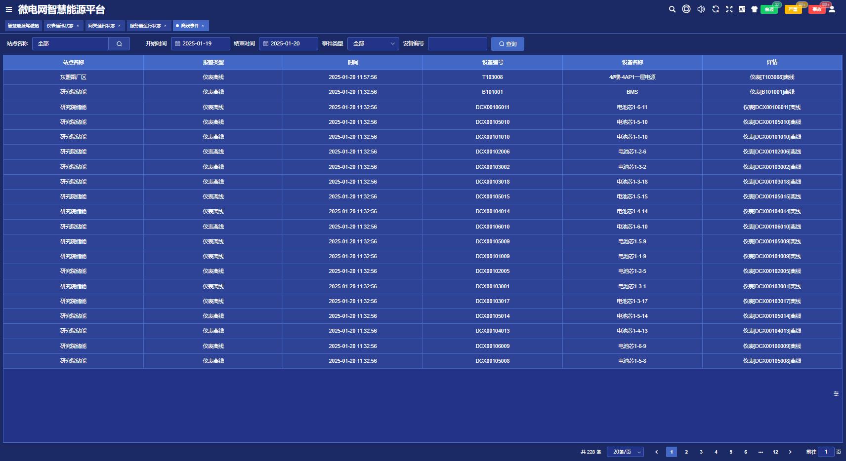 离线事件页面主要用于记录智能设备,包括但不限于仪表、传感器和网关等设备发生的通讯中断日志(仅允许查询一个月内的离线日志)。支持时间、离线类型或编号等列进行数据筛选