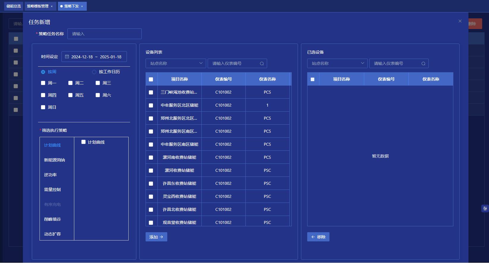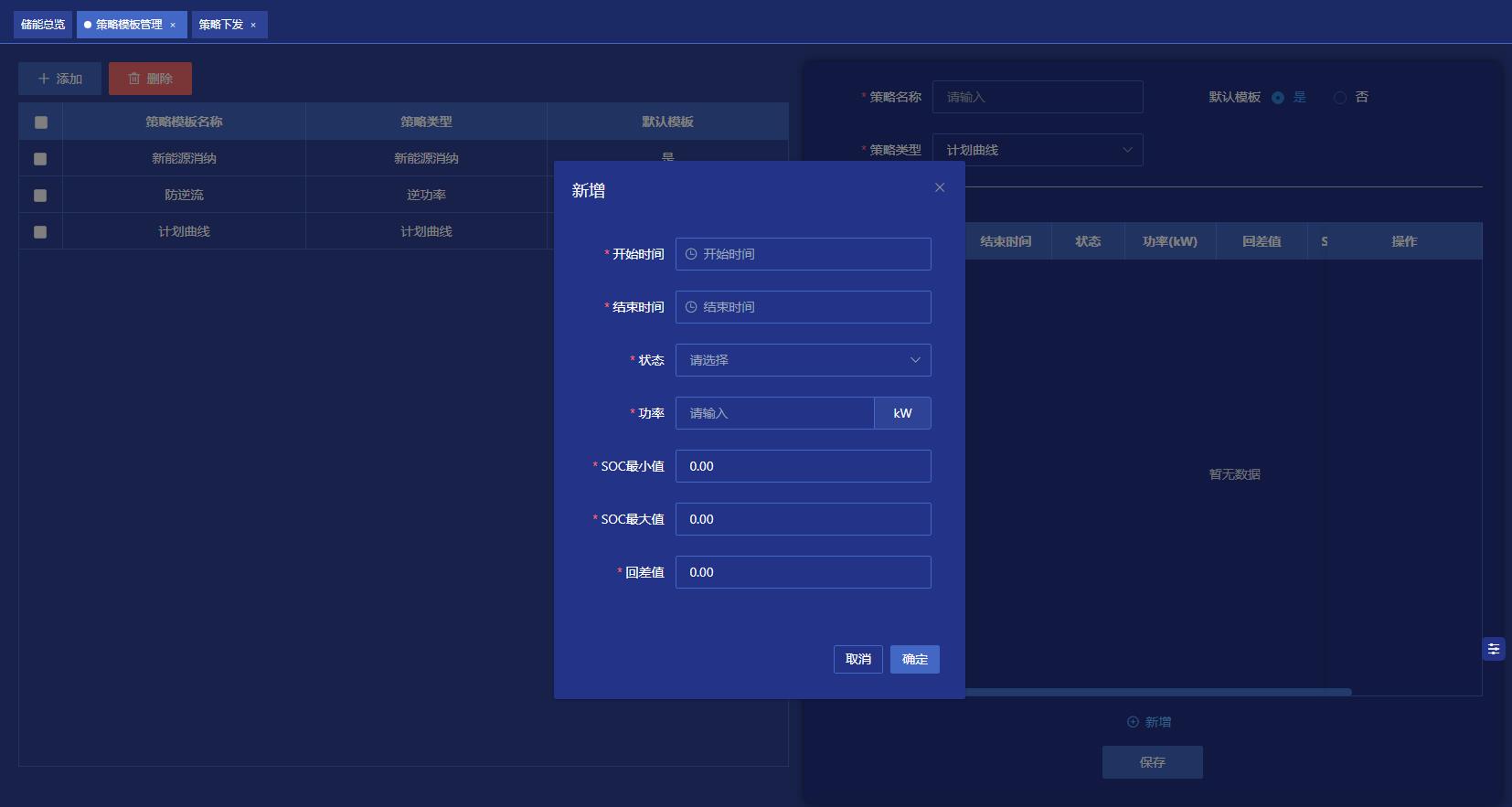 用于制定策略模版,根据“策略类型”进行模块切换,添加计划曲线、削峰填谷、新能源 消纳、需量控制、动态扩容、逆功率等策略模版。再制定并管理储能策略模版中,选中某个策略后,右侧配置动画将展开;左侧可对储能模版进行增删改查,点击“添加”按钮时右侧展 示空白策略模版生成悬浮窗,可输入自定义的策略模版名称,设定是否为默认模版(一值, 设定为默认模版后,在策略下发页面每次进入将默认勾选);执行类型(计划曲线、削峰填 谷、新能源消纳、需量控制、动态扩容、逆功率)等.