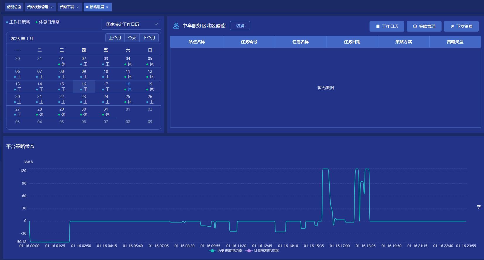 策略进展主要用于查看储能策略下发的进展情况。日历展示并区分“工作日策略”与“节 假日策略”,点击“上个月”、“今天”、“下个月”快捷切换按钮可快速切换不同日期策 略进展,默认展示当日策略数据,选中日历中的某天即切换展示对应日策略数据,选中的日 期将高亮;平台策略状态表格展示对应储能电站所处日期范围内的策略执行列表,状态曲线 展示当日充放电的状态。