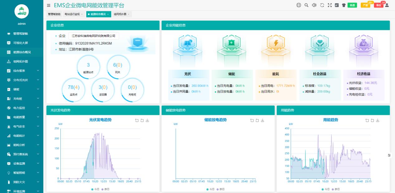 (1)对单个企业下各能源进行监测统计,实时统计储能充放电、负荷用能、新能源发 电和收益情况,并展示光伏发电趋势、储能放电趋势和用能趋势.