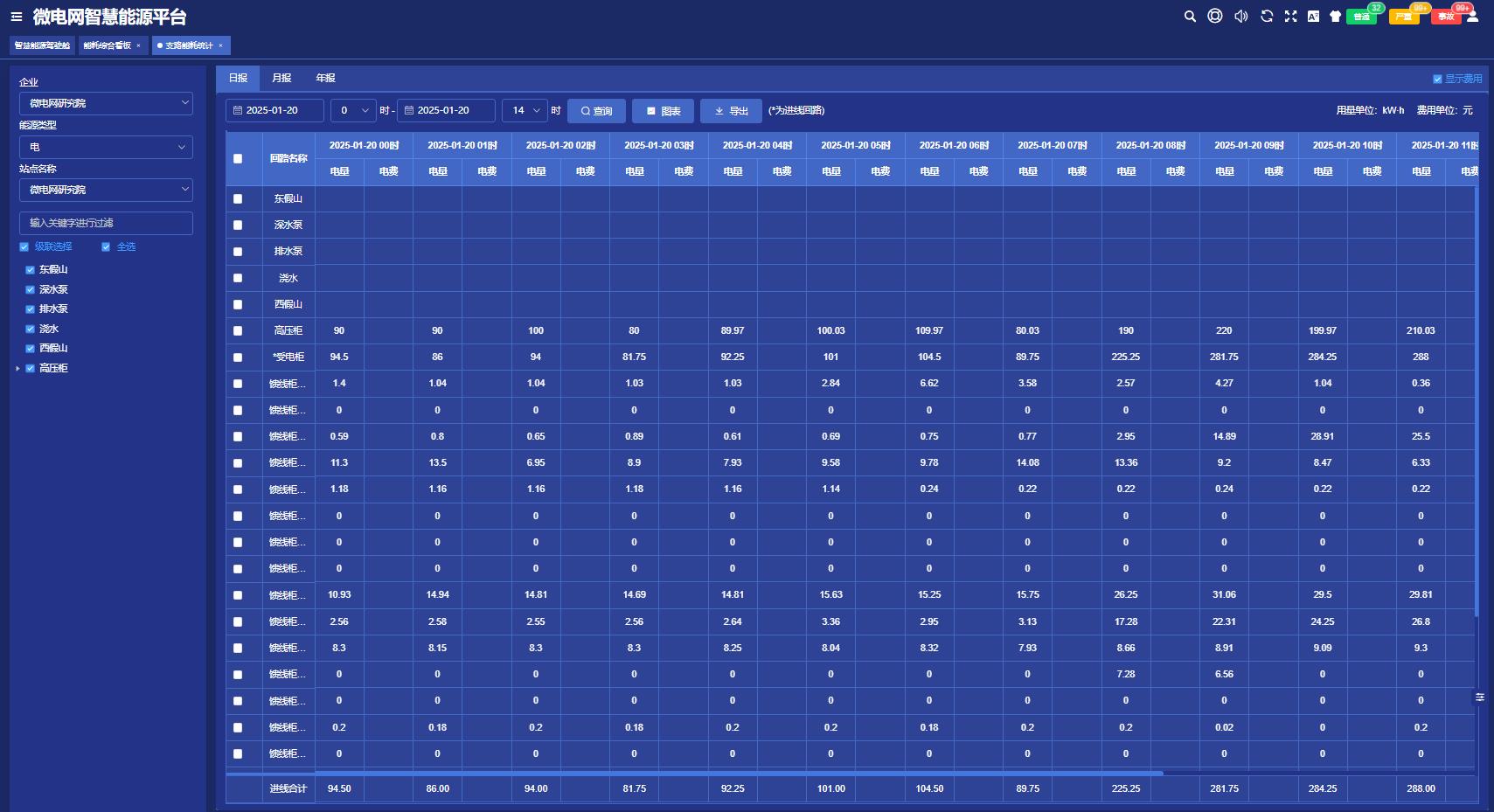 (2)可以查询任意时段内单个站点及总体的光伏发电量、负荷用电量、储能充电量、 储能放电量等,并支持导出成 excel 文件。