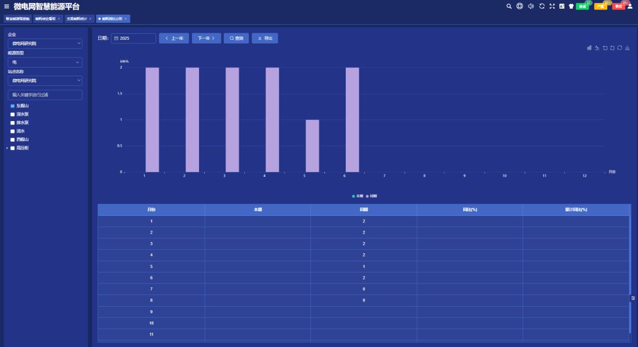 查看选定回路选择年份的每个月的能耗与上一年同期数据之间的对比情况,直观展示用 能数据差异。提供柱状图对比与数据报表对比。 支持导出 EXCEL 表格。