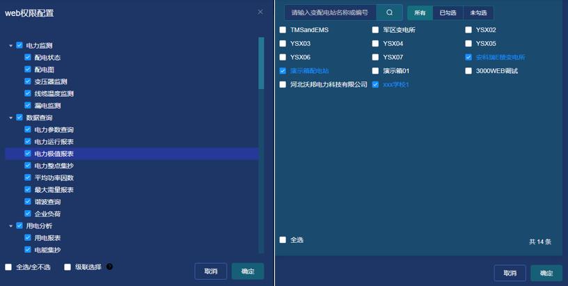 以角色为单位进行批量授予菜单权限,可根据用户分配可访问的变电所,使用户只能访问指定变电所的数据。