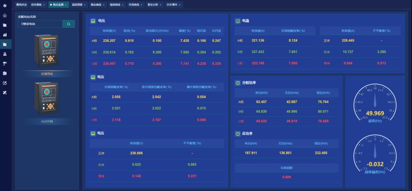 综合看板、稳态监测、谐波频谱、稳态曲线、谐波曲线、负荷曲线、暂态分析、SOE事件。
