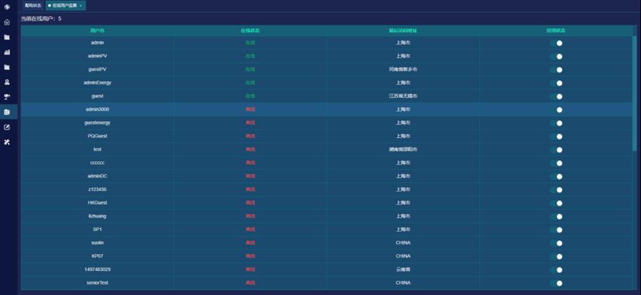 管理员可查看所有登陆过的账号情况,并可查看当前在线状态和最后一次访问平台的所处位置,如发现某账号异常可直接禁用让其退出访问平台。