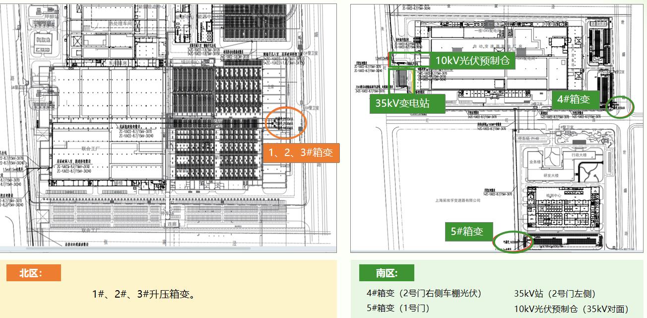 项目为屋顶分布式光伏项目,该项目的容量为21.35MW,项目采用自发自用、余电上网的消纳方式。利用原有的电源点作为光伏高压并网点并入电网端,在东区和西区设置一次预制舱,预制舱内安装有光伏出线柜,计量柜,光伏集电柜,PT柜,站用变柜,光伏并网柜。逆变器发的电通过10个低压并网柜并入0.4kv母线通过变压器升压后并入10kv电网,东区、西区集中并网点经过箱变升压后并入10kv电网。