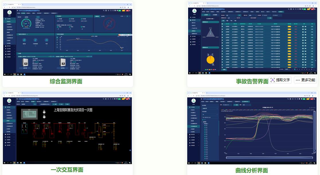 监测站内电能质量检测仪所采集数据,如电压有效值,偏差率,谐波畸变率,电流有效值,分相功率,总功率等;通过柱状图展示电能质量检测仪谐波和间谐波各频谱;通过曲线图展示三相电流/电压谐波数据、实时负荷曲线、有效值/波动/偏差/闪变等参数;展示所选站点下全部电能质量检测仪所有暂态事件。