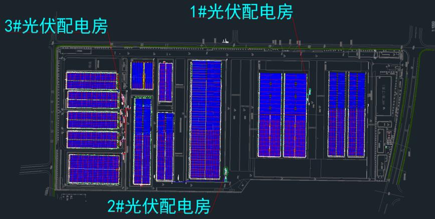 光伏组件选用550Wp单晶硅光伏组件;逆变器选用组串式逆变器,1500V系统,容量为225kW,1#光伏配电房30台、2#光伏配电房28台、3#光伏配电房27台,共计85台逆变器,装机容量5999.95kWp,共计总装机容量18MW。