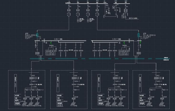 光伏电站经汇流后经逆变器逆变为0.8kV交流电压,再经2台1600kVA升压变升压至10kV。10kV预制仓主接线形式采用单母线接线,单点并网。高压配电室和监控设备处同一配电房内。
