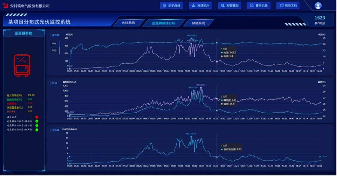 展示光伏电站名称、位置、逆变器数量等基本信息;统计当前光伏电站日、月、年发电量;按汇流数据分散分析每组光伏组件发电功率以及工作状态。