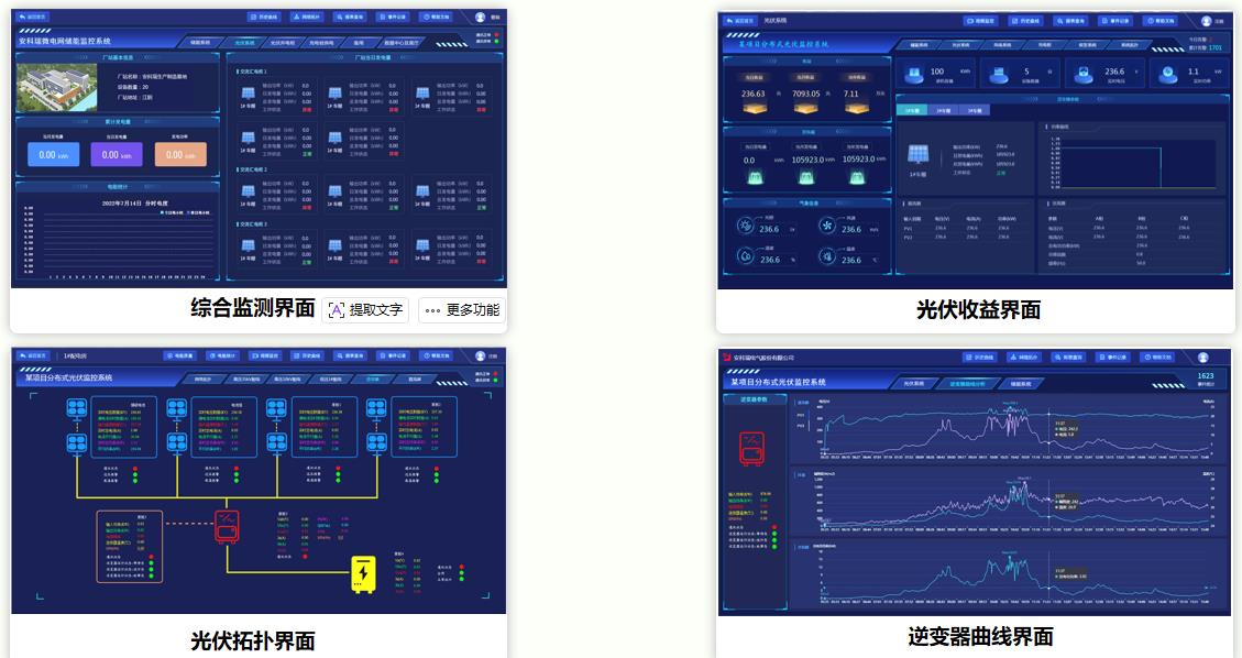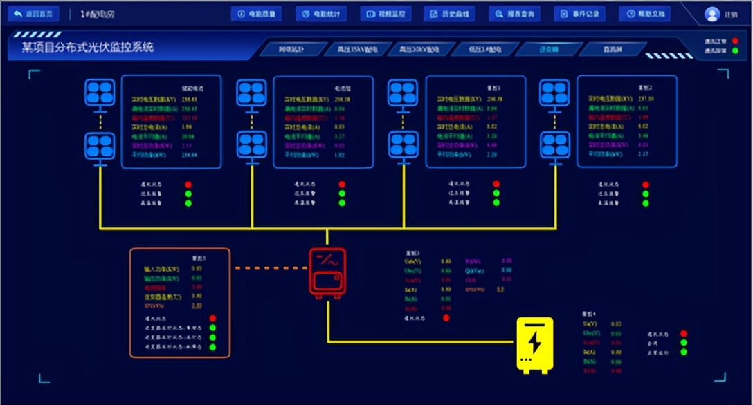 监测整个光伏阵列各个组件的电压、电流、功率等电参量信息;监测逆变器当前输入功率、输出功率、温度及当前状态等信息;监测逆变器交直流侧电参量信息。