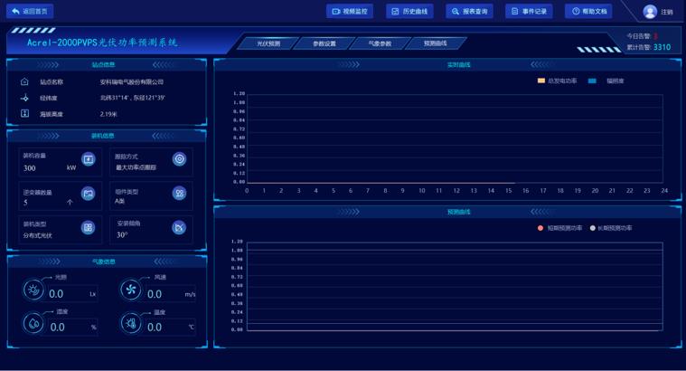 光伏发电功率预测系统通过采集数值天气预报数据、实时环境气象数据、光伏电站实时输出功率数据、光伏组件运行状态等信息,可按照电网调度技术要求,实现标准格式的短期功率预测(预测光伏电站未来0h-168h的光伏输出功率,时间分辨率为15min)、超短期功率预测(预测未来15min-4h的光伏输出功率,时间分辨率为15min),以及光伏电站实时气象数据、装机容量、投运容量、大出力等信息的上报。同时,光伏电站的功率预测与主站之间应具备定时自动和手动启动传输功能。