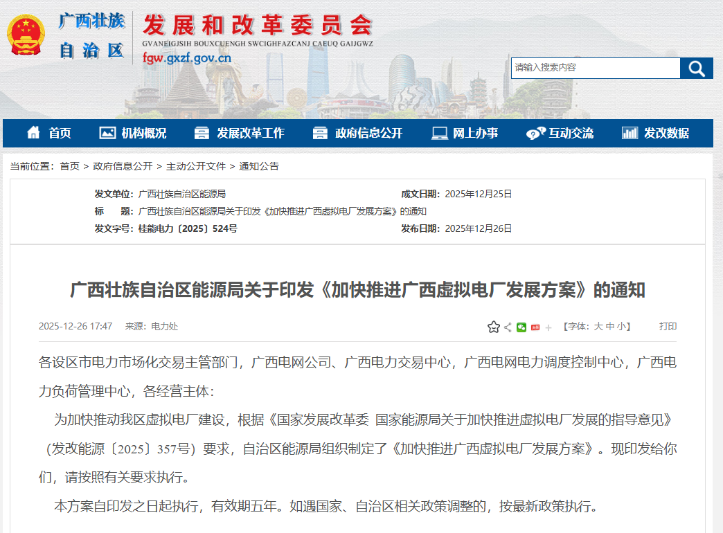 为深入贯彻落实“四个革命、一个合作”能源安全新战略,围绕国家综合能源安全保障区建设目标,加快推进虚拟电厂发展,充分发挥虚拟电厂在构建新型电力系统和完善电力市场体系的重要作用,根据《国家发展改革委国家能源局关于加快推进虚拟电厂发展的指导意见》(发改能源〔2025〕357号)要求,结合广西实际,制定本方案。