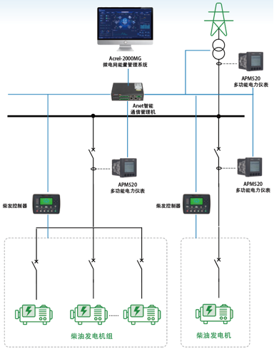 柴油发电机在虚拟电厂中从单纯的“备用”扩展到了“可调度的资源”。可采用Acrel-2000MG能量管理系统对柴发控制器远程启停控制、功率精准调节与运行状态监测,将柴油发电机整合为虚拟电厂的可调度资源。部分地区对柴油发电机参与虚拟电厂给予政策支持,促进柴油发电机在虚拟电厂中参与应急和调峰。