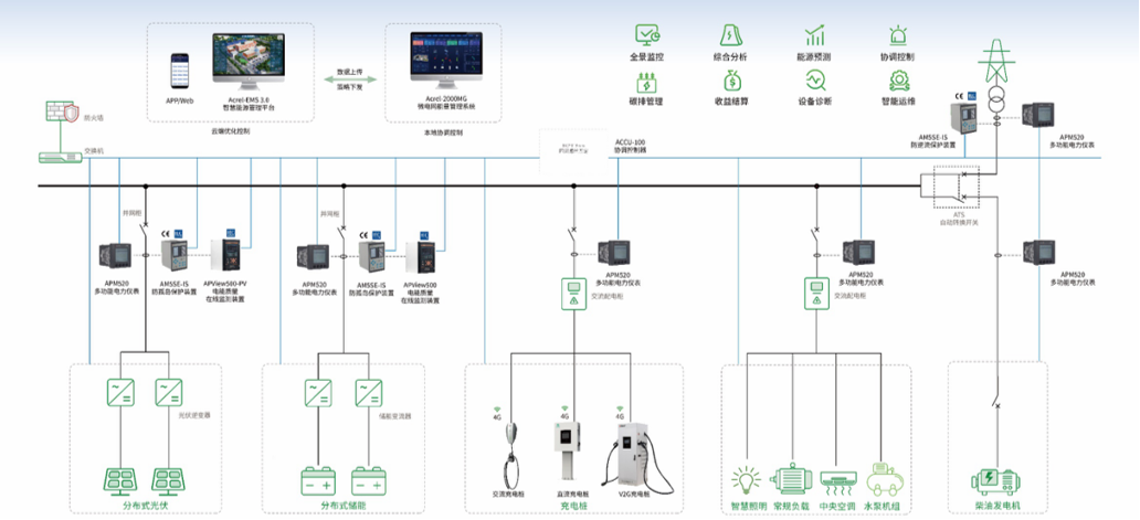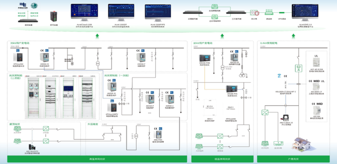 安科瑞分布式光伏解决方案,通过对光伏配置计量、监测、保护与治理等产品,满足光伏实时监控、安全接入、发电管理、功率控制等需求,控制光伏精准参与虚拟电厂与市场交易,大化提升绿色能源的消纳与收益。