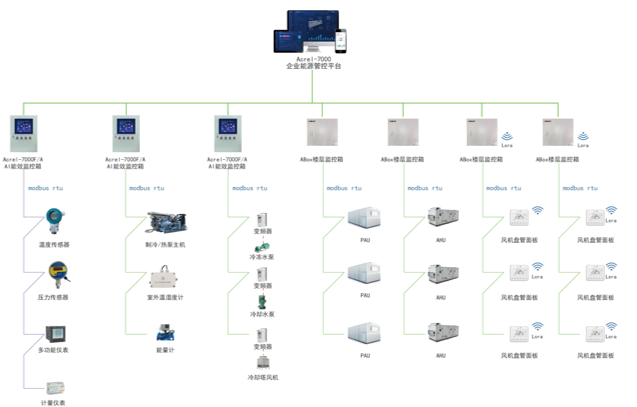 安科瑞智慧空调控制系统利用AI能效监控箱通过表计、温度、压力传感器、温度计和能量计等进行采集分析,对水泵、风机、变频器、预冷空调箱、组合式空调箱等进行温度设定调节、运行策略优化等控制,将空调聚合为虚拟电厂的快速响应单元,在不影响舒适度的前提下实现精准的负荷调控,为电网提供可持续的削峰填谷能力。