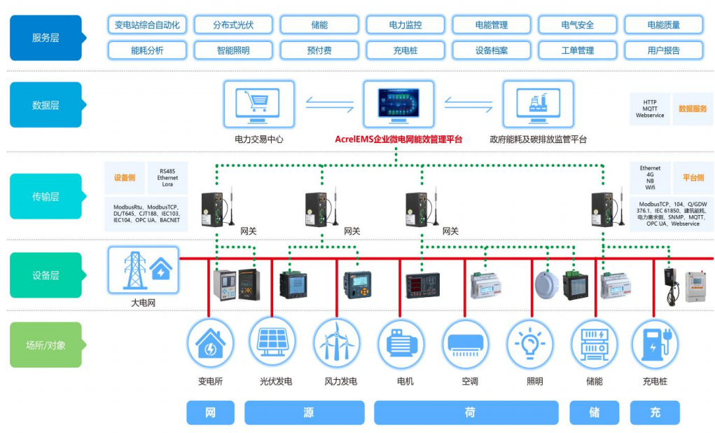 安科瑞源网荷储智慧能源管理平台解决方案,通过在企业内部的源、网、荷、储、充的各个关键节点安装安科瑞自主研发的各类监测、分析、保护、治理装置通过控制、计量、通信等技术,将分布式电源、储能系统、可控负荷、电动汽车、电能路由器聚合在一起;平台根据新的电网价格、用电负荷、电网调度指令等情况,灵活调整微电网控制策略并下发给储能、充电桩、逆变器等系统与设备,保证企业微电网始终安全、可靠、节约、高效、经济、低碳的运行。